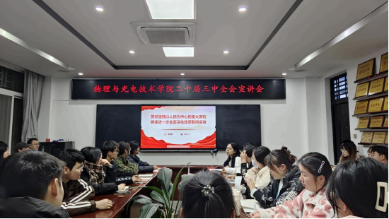 11月28日晚,tyc122cc太阳成集团在主教楼207会议室召开了“党的二十届三中全会”主题宣讲会。宣讲会由校宣讲团成员之一、公司本科生第一党支部书记樊旭娜主讲,全体员工党员参加此次宣讲会。